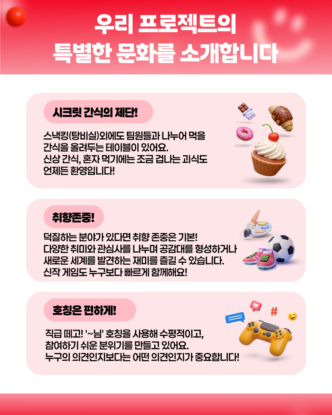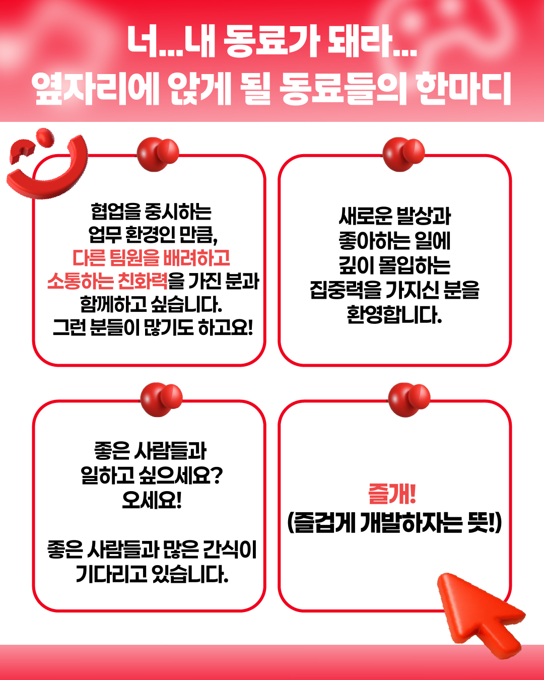 좋은 사람들과 즐겁게 일하는 이 팀의 동료가 되고 싶다면, 지금 바로 지원하세요!