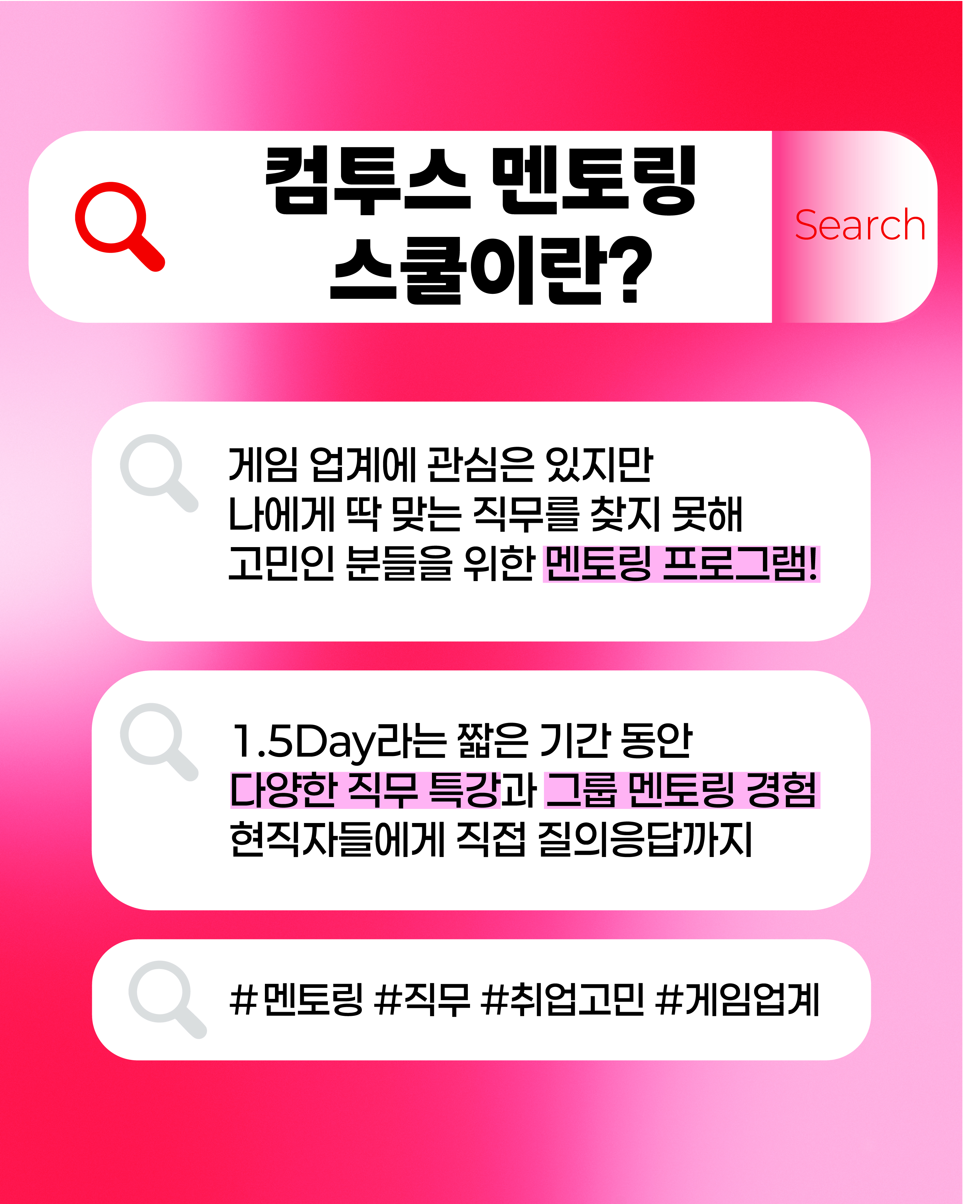 이번 기회를 놓치지 마시고 꼭 지원해보세요. 컴투스 멘토링 스쿨이 당신의 커리어 퀘스트의 시작이 되기를 바랍니다.