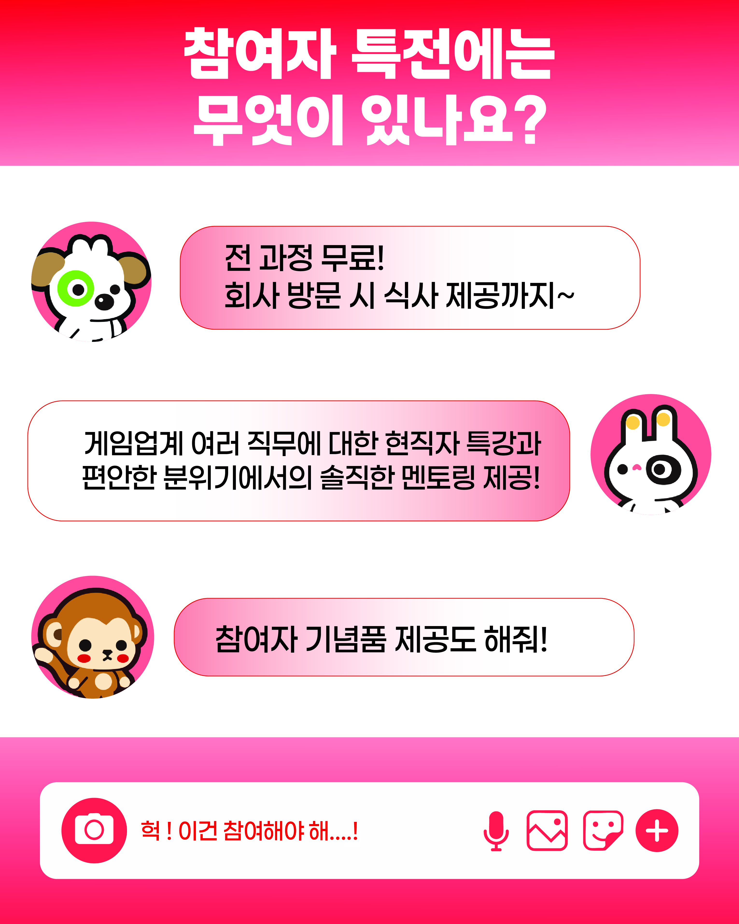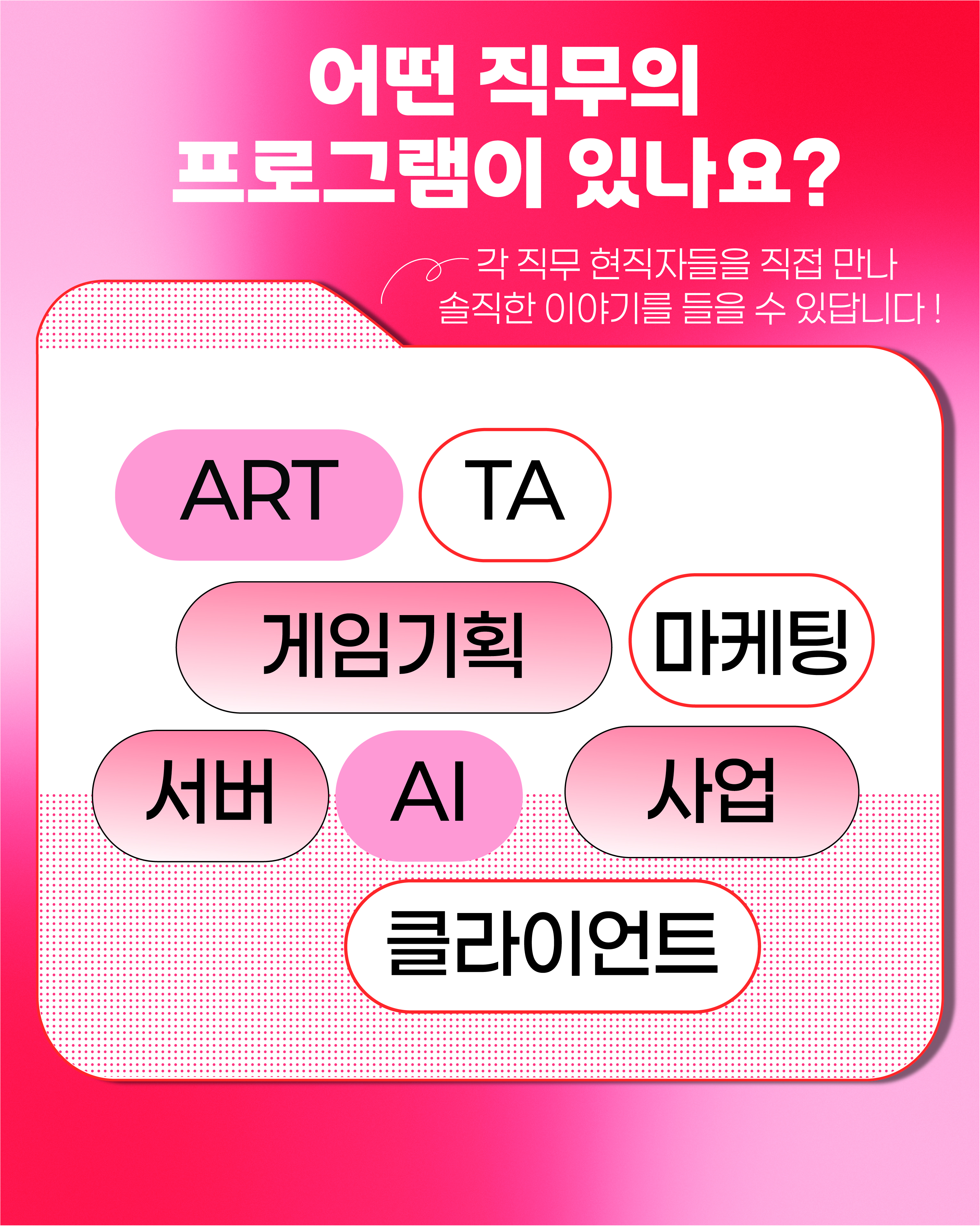 ⭐프로그래밍(클라이언트, 서버, AI)와 게임아트, TA, 게임 기획 그리고 게임사업/마케팅⭐까지 총 8개의 직무가 총출동하는 알찬 시간을 준비했어요.