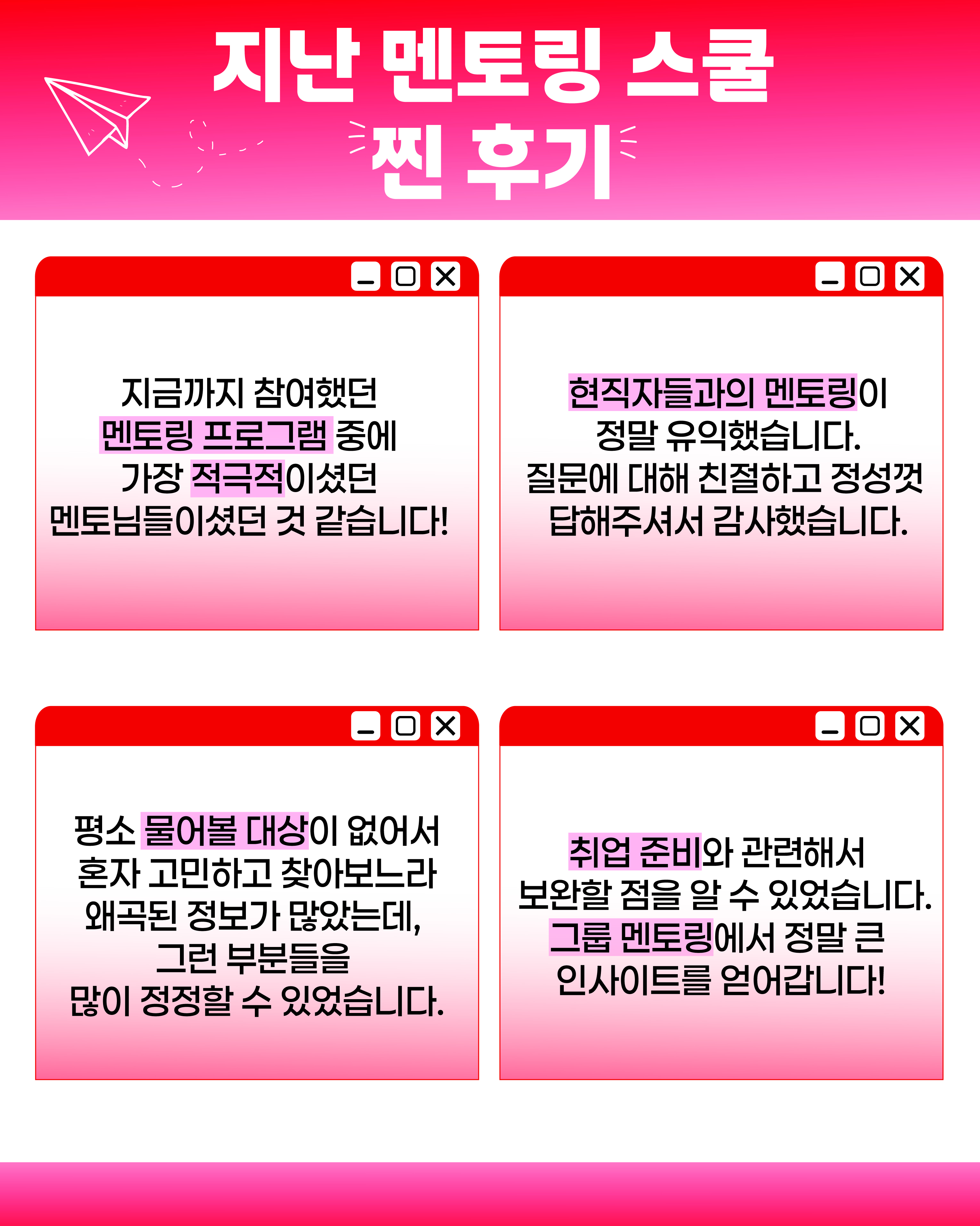 이 후기에 더해, 멘토링 스쿨 지원페이지로 가시면 ❤️합격자들의 지원 꿀팁❤️도 있으니 놓치지 마세요.