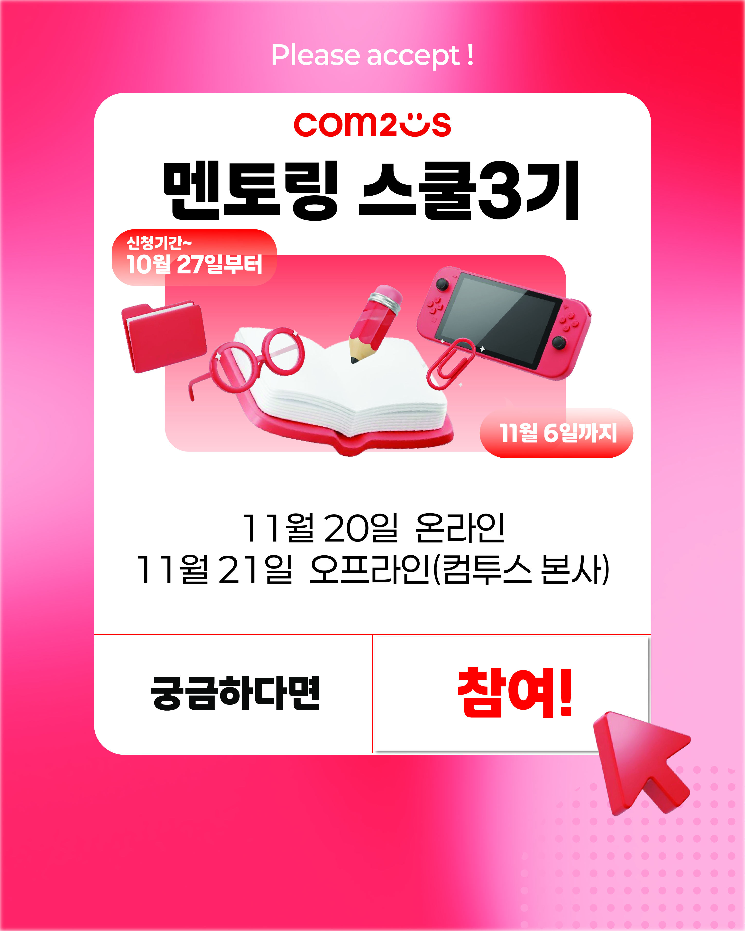 컴투스 멘토링 스쿨 3기는 10월 27일부터 11월 6일 오전 10시까지 모집합니다.