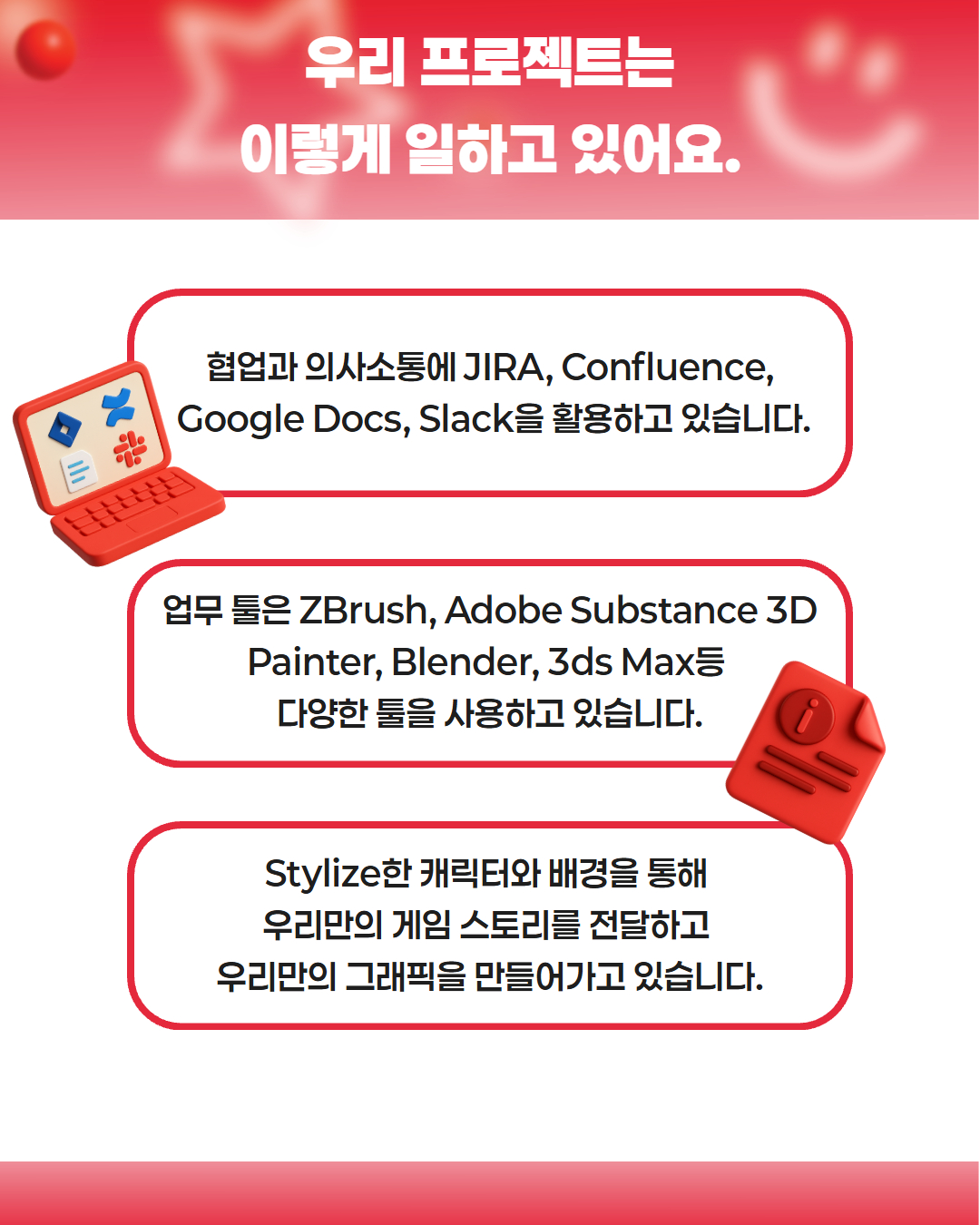 안녕하세요! 이번에 소개드릴 부서는 바로바로~ 3D를 통해 세계를 디자인하는 서머너즈 워 차기 RPG 모델링팀입니다! ✨✨ 창의력과 열정으로 매일 새로운 무대를 만들고 있는 모델링팀! 지금부터 같이 알아볼까요? “열정이 곧 실력입니다 우리는 그걸 믿습니다⚡” 실력 아래에서 함께 배우고 새로운 도전을 향해 나가는 서머너즈 워 차기 RPG 모델링팀! 여러분의 전문성이 빛날 수 있는 무대가 지금 준비되어 있습니다! 우리 팀에 합류하고 싶다면 지금 바로 지원하세요!❤️ Share