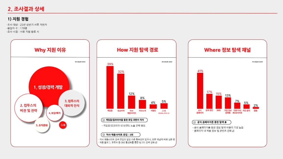 실제로 지원자분들의 경험 서베이를 토대로 꾸준히 데이터를 분석하고 있습니다. 컴투스 지원자분들이 어떤 사유로 지원을 결심해주시는 것인지, 어디서 가장 많은 정보를 얻고 계신지, 더 필요한 정보가 무엇이 있으실지 등 이 분석 과정을 통해 인사이트를 얻곤 합니다. 컴투스 채용 유튜브 채널도 6년째 굉장히 열심히 운영하고 있는데 이것도 사실 ‘지원자분들에게 어떻게 하면 더 많은 정보를 보기 쉽게 전달할 수 있을까’에서 출발하여 지금까지 온 것 같아요.
