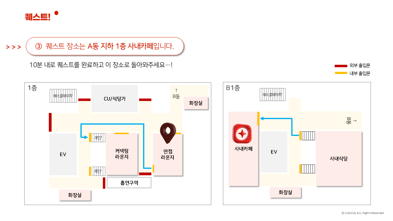 퀘스트 내용은 아래 제시해드린 지도를 참고하여 사내 카페를 찾아 원하는 음료☕ 한 잔을 테이크아웃 해오는 간단한 미션입니다.